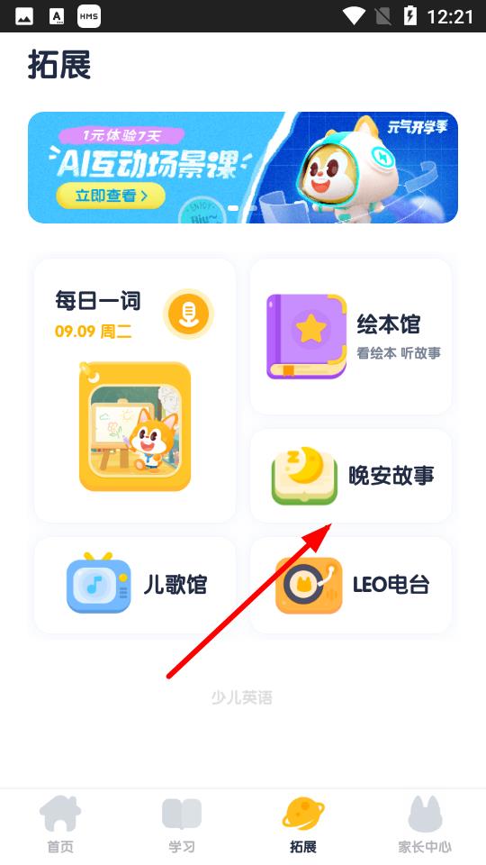 2、在拓展页面里,找到并点击晚安故事选项,进入故事页面。
