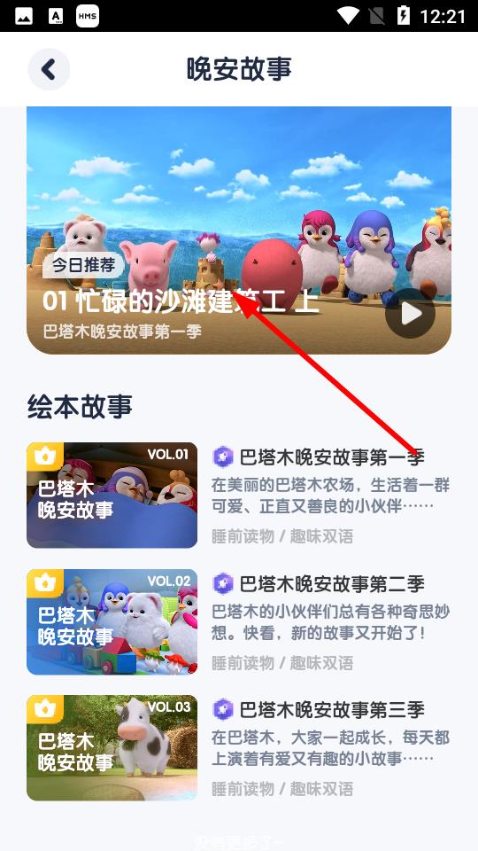 3、进入晚安故事页面后,选择想要听的故事,点击该故事的播放按钮。