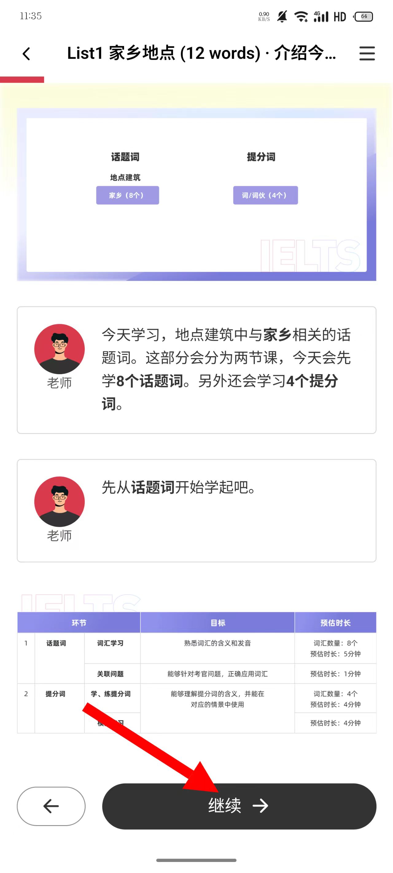 4、进入List1家乡地点学习页,点击底部继续按钮,开始学习相关话题词。