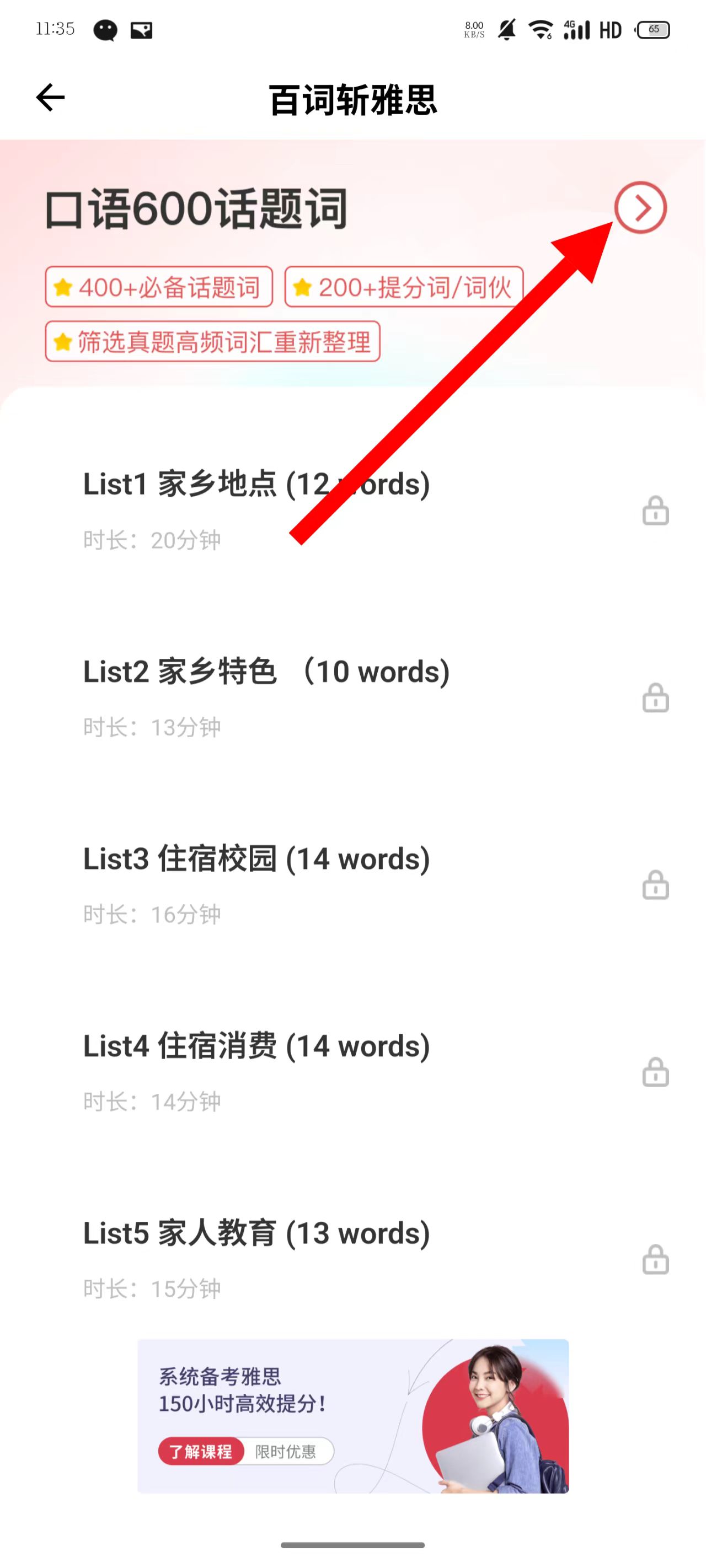 2、进入口语600话题词页面后,点击右上角的箭头图标。