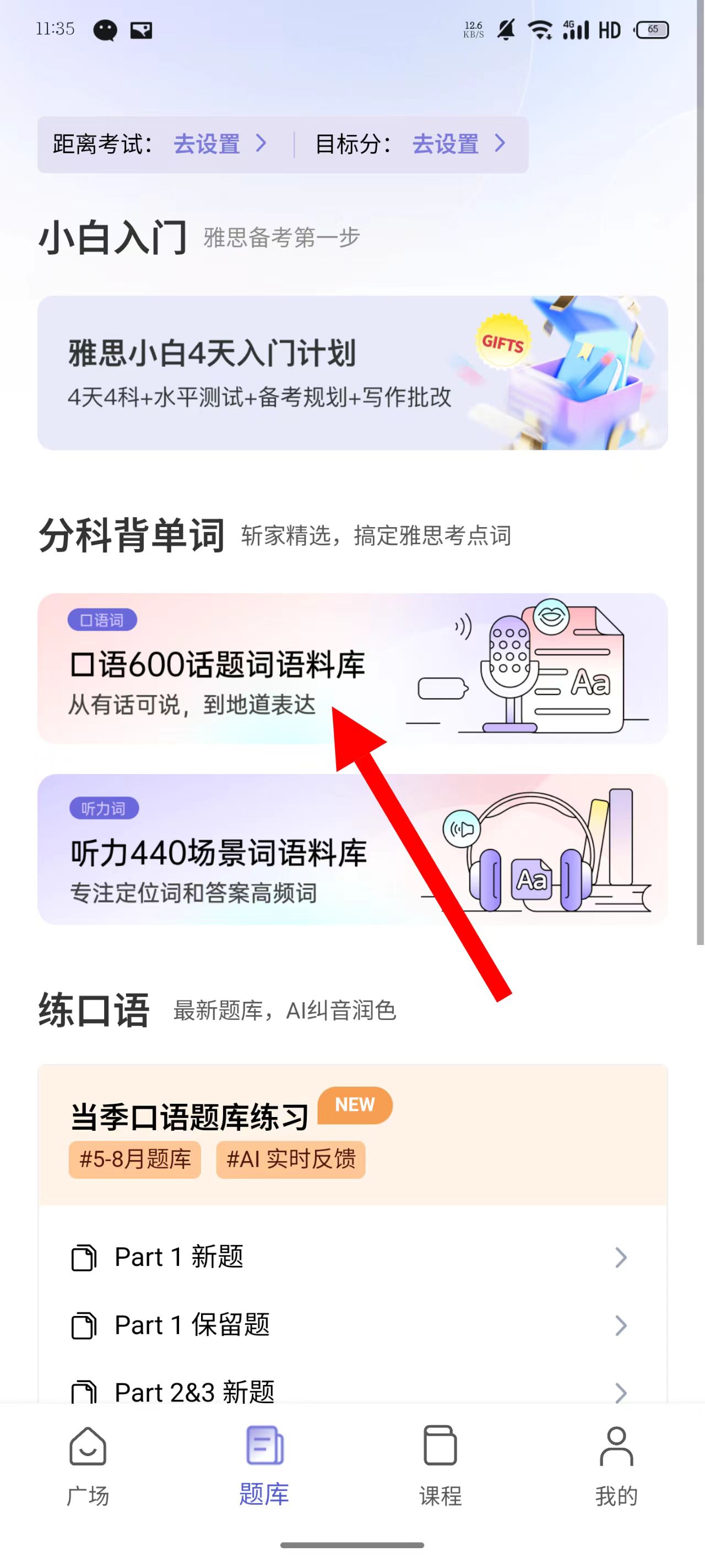 1、打开APP,在题库页面点击口语600话题词语料库。