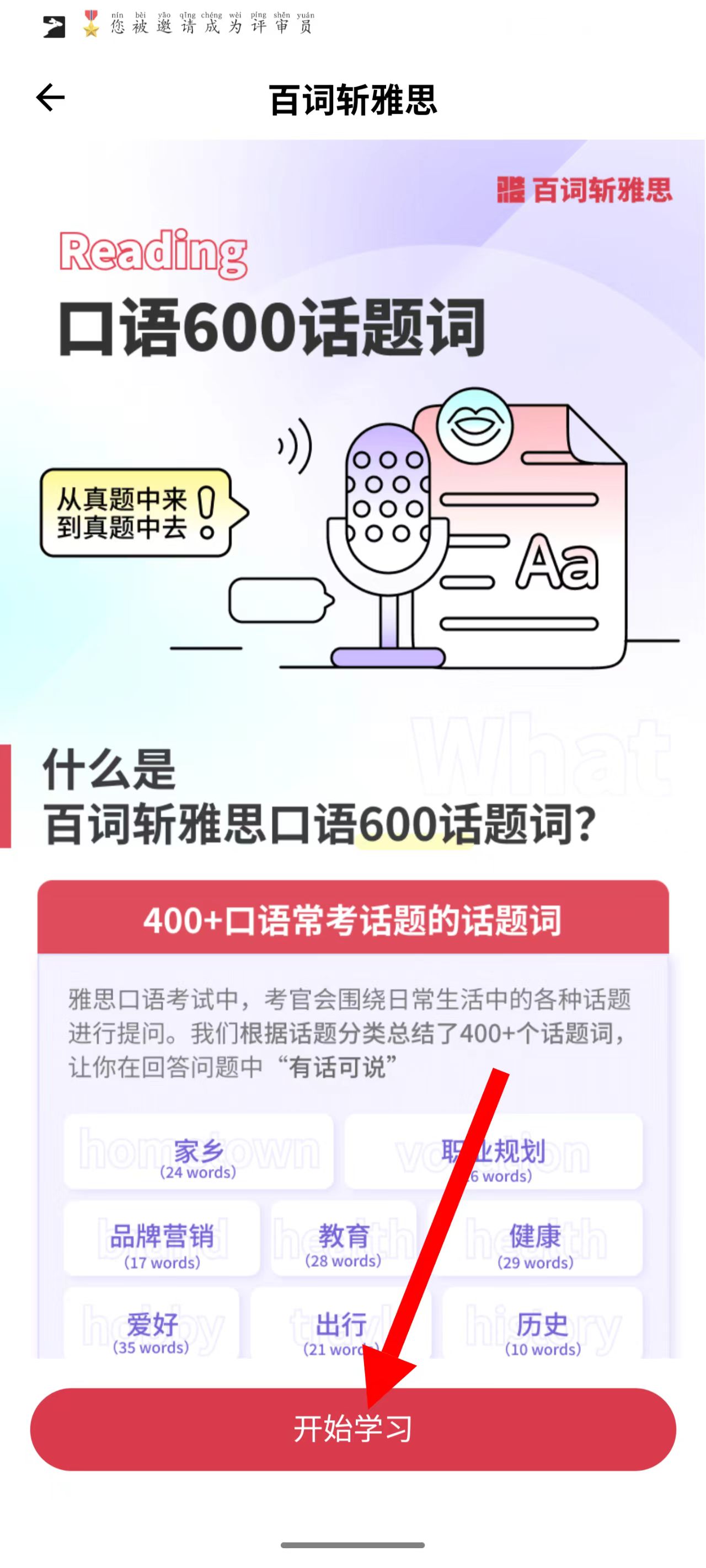 3、在口语600话题词介绍页,点击开始学习按钮。