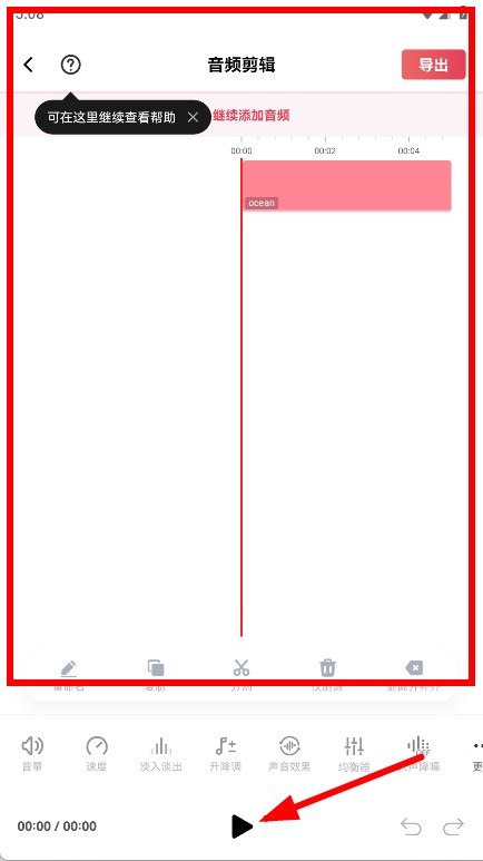3、点击底部播放按钮预览音频,通过工具对音频进行剪辑,还能点击继续添加音频补充素材。