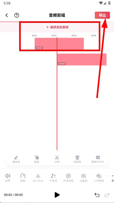 4、音频剪辑完成后,点击右上角导出按钮,将剪辑好的音频导出保存。
