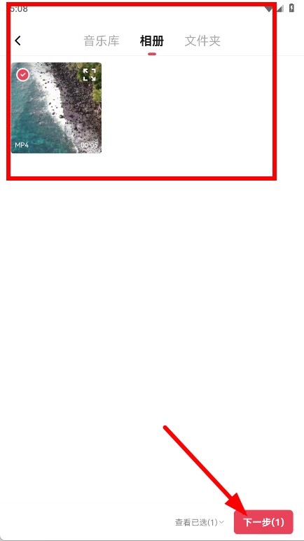 2、进入素材选择页,在相册中选中目标视频素材,点击下一步。
