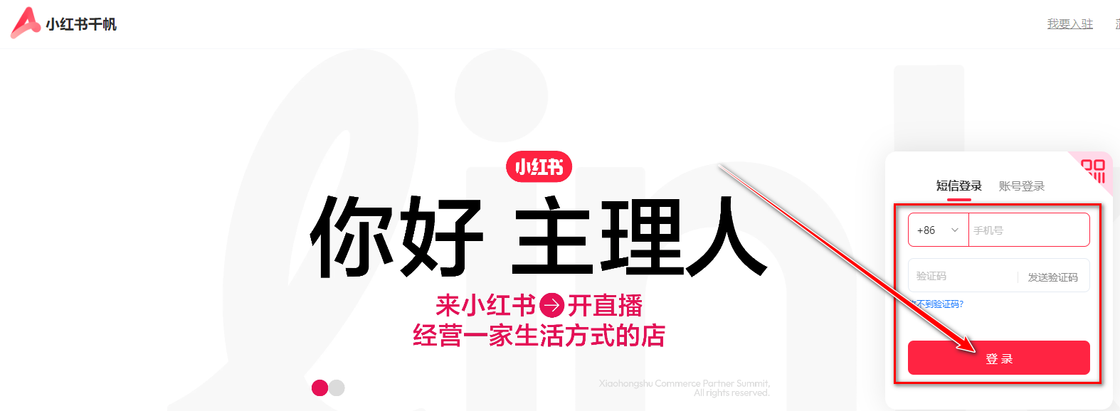 1、首先打开小红书千帆PC端https://customer.xiaohongshu.com/login?service=https://ark.xiaohongshu.com/ark/login,输入主账号手机号码和验证码,然后点击登录。