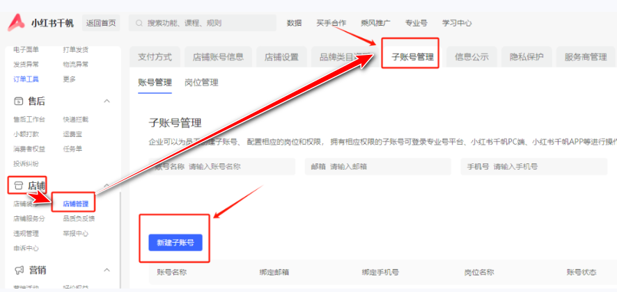2、接着点击店铺、店铺管理、子账号管理、新建子账号。