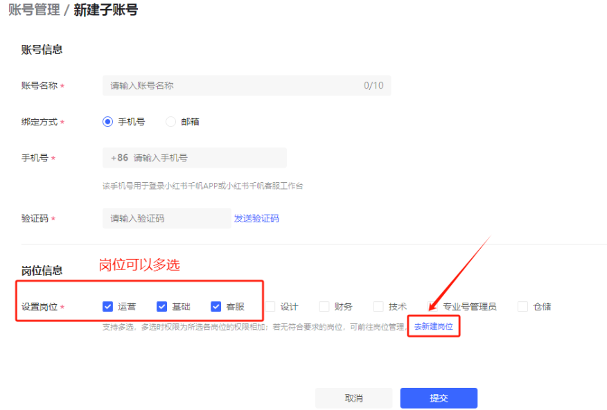 4、注意,在创建子账号时,可以为不同的岗位赋予不同的权限。岗位信息支持多选,多选时权限为所选各岗位的权限相加;如果您的店铺中没有合适的岗位选项,可以点击去新建岗位来添加新的岗位。