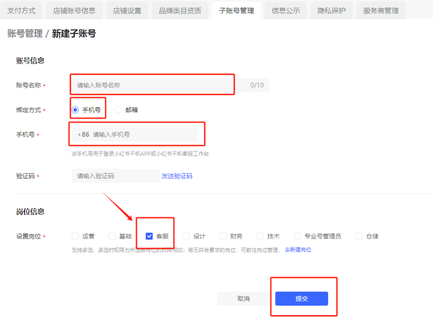 3、先输入账号名称、勾选绑定手机号、输入手机号、手机验证码、勾选岗位,最后点击提交。