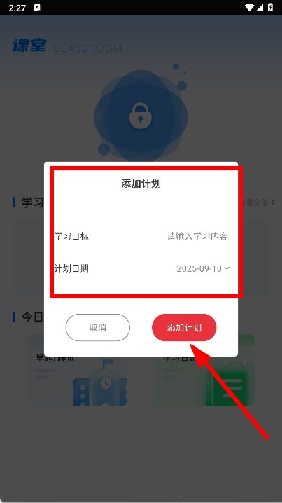 4、输入学习目标,选择计划日期,然后点击添加计划按钮,完成计划添加。