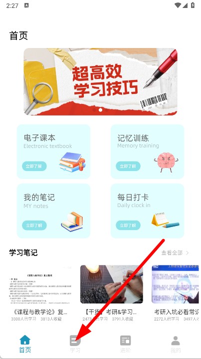1、打开APP,点击底部导航栏的学习选项,进入学习页面。
