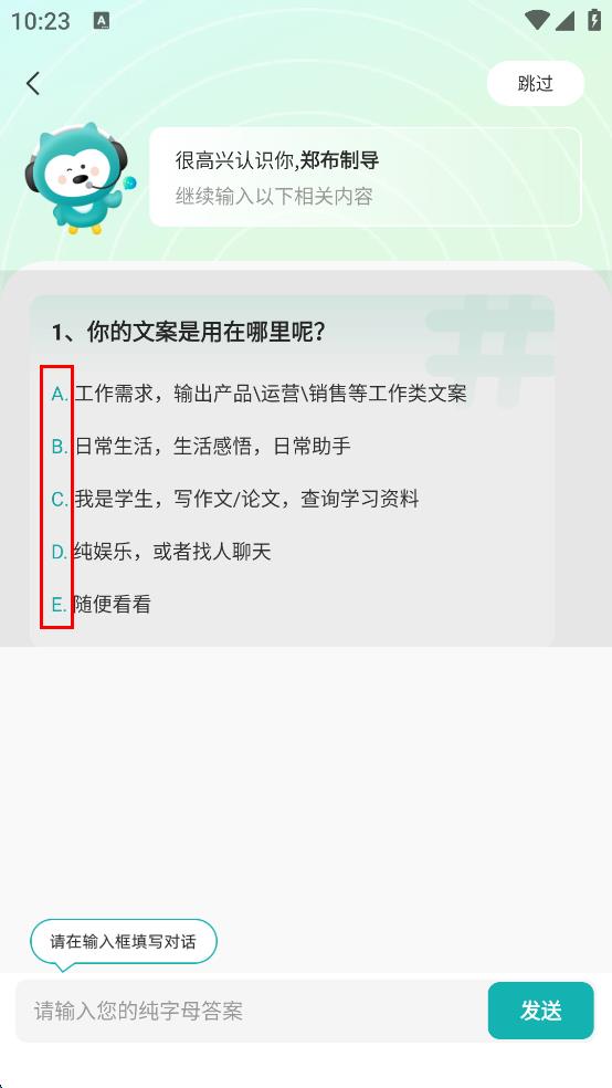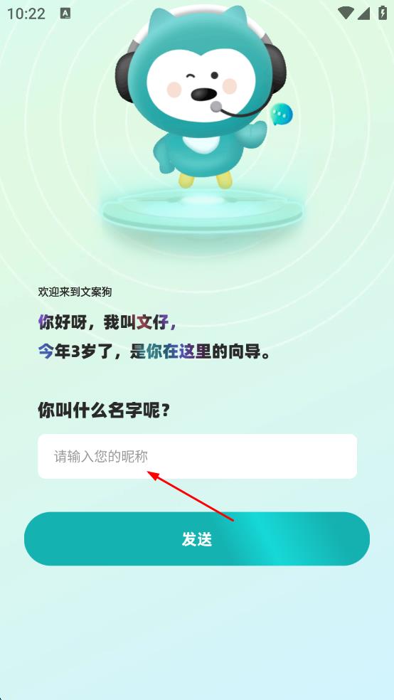 2、进入文案狗欢迎界面后,在“请输入您的昵称”输入框中输入自己的昵称,然后点击“发送”按钮。