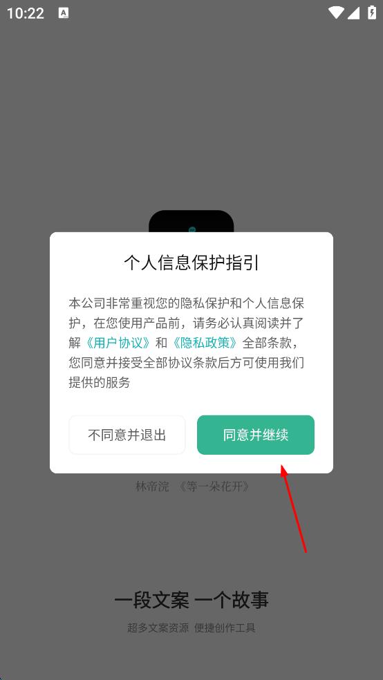 1、打开文案狗app,在弹出的个人信息保护指引界面,找到“同意并继续”按钮,点击该按钮。