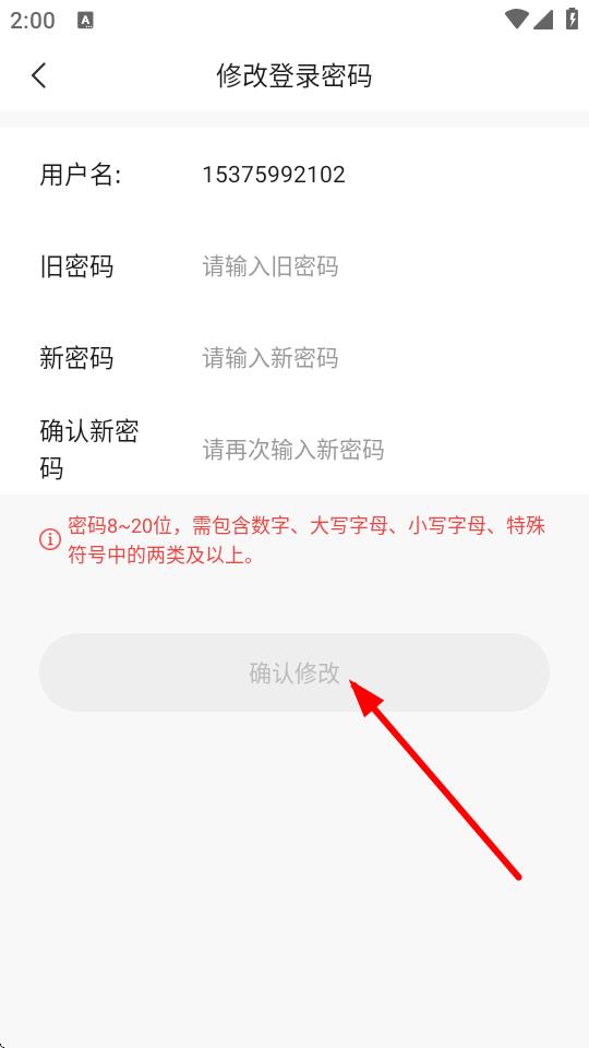 4、在修改登录密码页面,依次输入旧密码、新密码以及确认新密码,最后点击确认修改按钮。