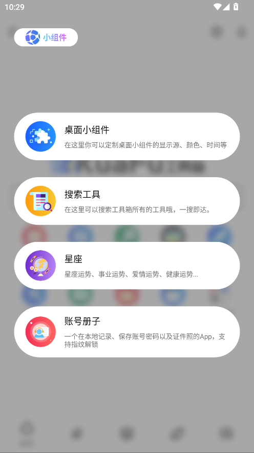 此外,应用还提供了其他丰富的功能,例如,你可以在工具箱中创建桌面小组件,将常用的工具或功能直接放置在桌面上,便于快速访问。此外,还有搜索工具和星座查询等功能,让你轻松获取所需信息,真正实现多功能、全方位的使用体验。