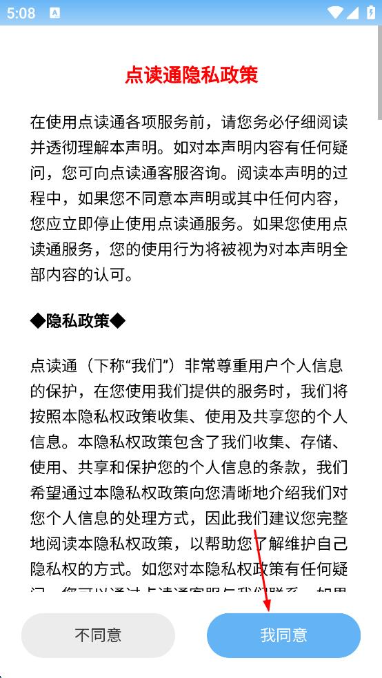 1、打开点读通软件,弹出“点读通隐私政策”页面,仔细阅读相关内容后,点击“我同意”按钮,进入软件主界面。