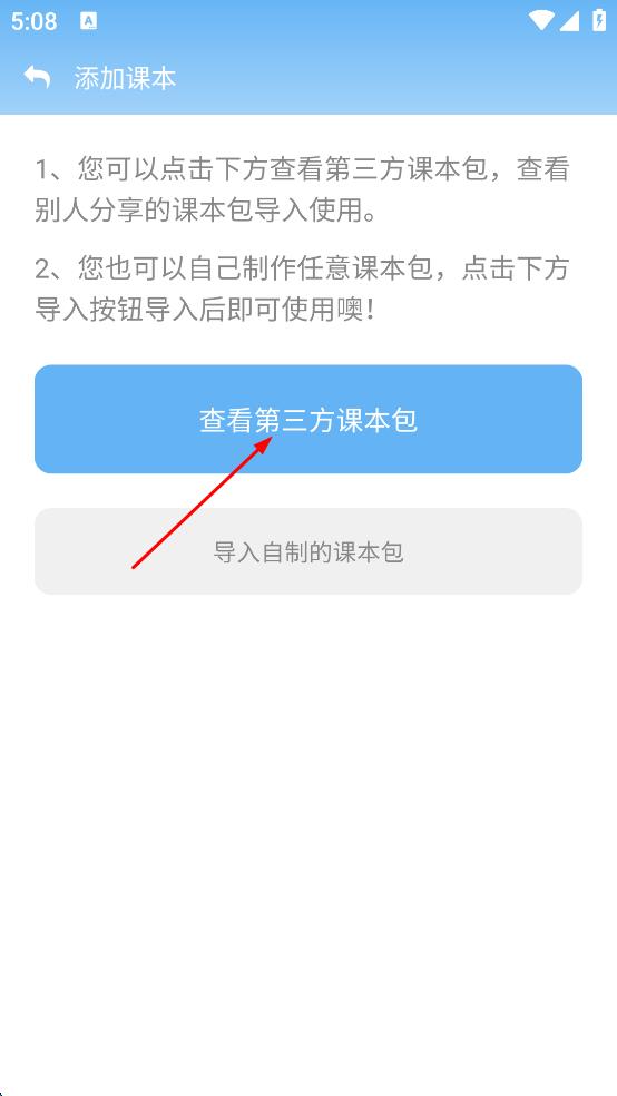 3、在添加课本页面,有“查看第三方课本包”和“导入自制的课本包”两个选项,点击“查看第三方课本包”按钮,进入第三方课本包查看页面。
