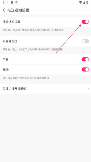 4、在推送通知设置页面,点击接收通知提醒右侧的开关按钮,将其关闭。
