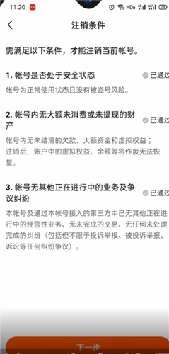 7、点击下一步,看看注销的三个条件是否通过了,已通过点击下一步,