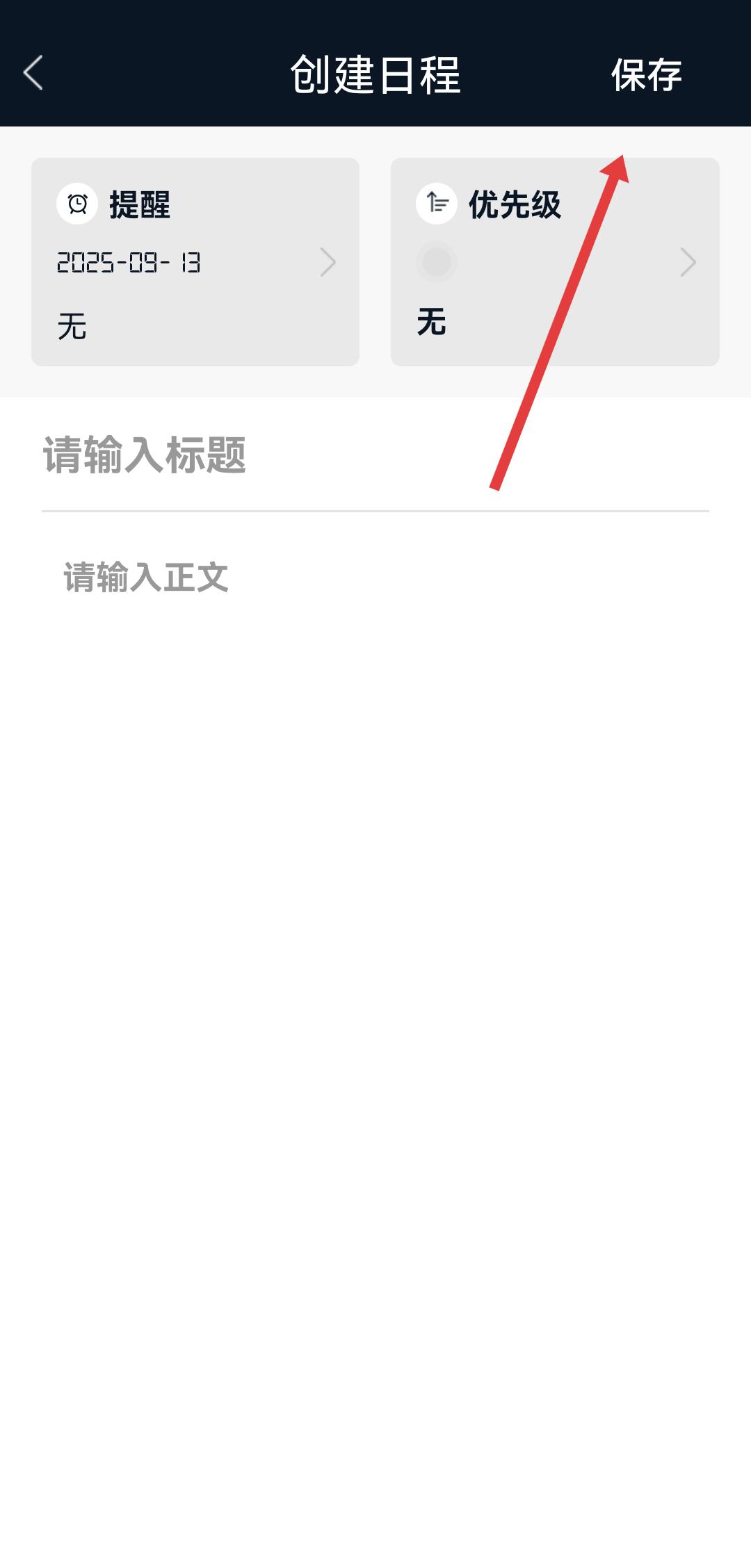 3、在创建日程界面,填写日程标题、正文等信息后,点击右上角保存按钮。