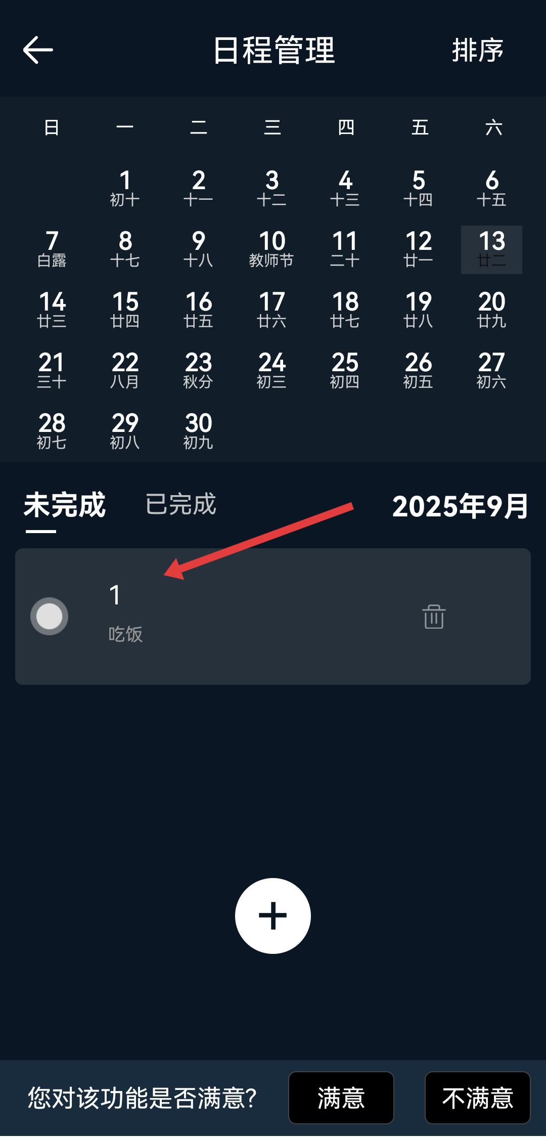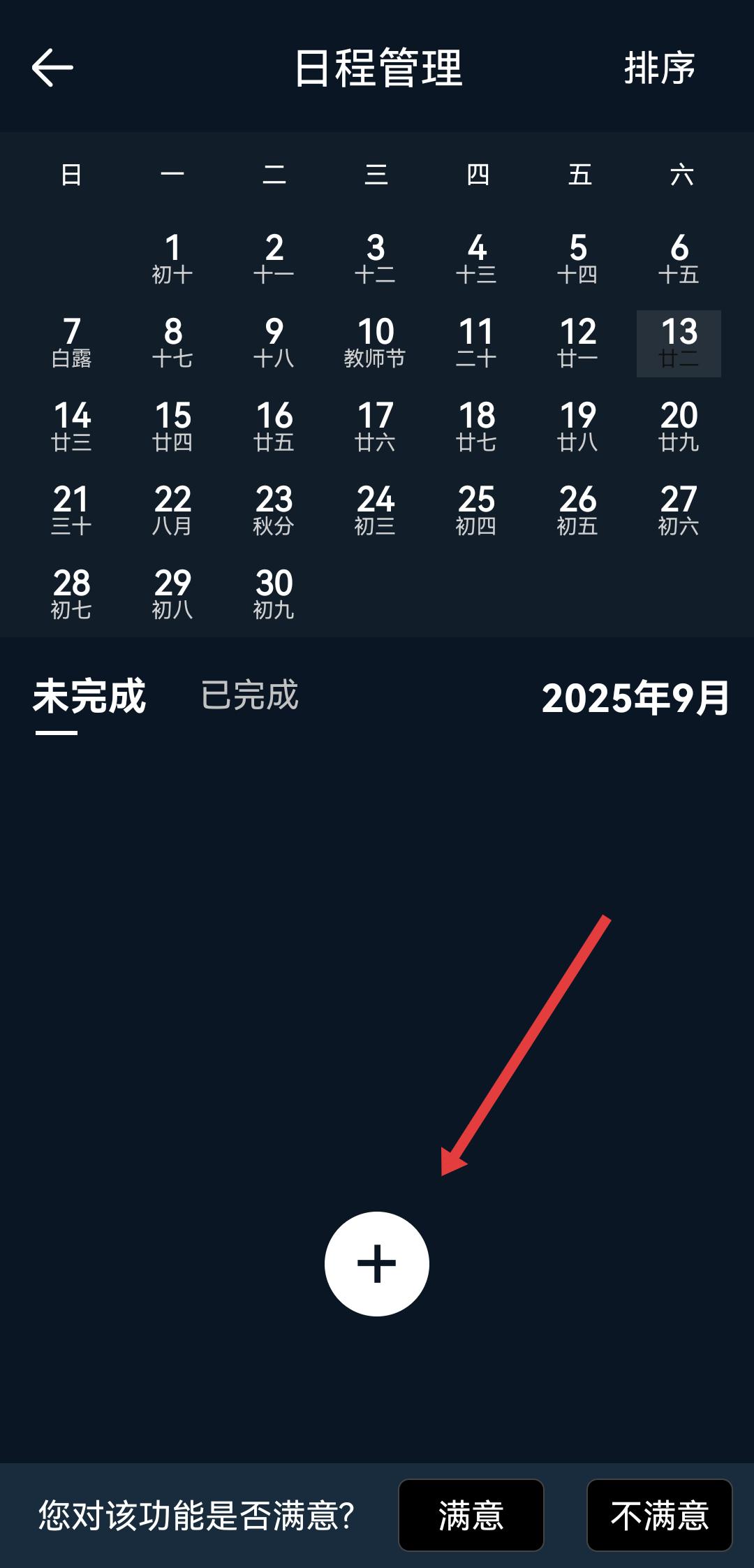 2、在日程管理页面,点击中间白色的+号按钮,进入创建日程界面。