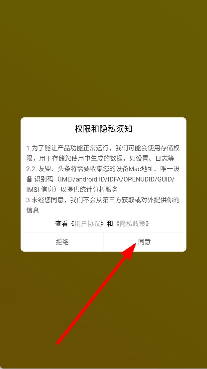 1、打开APP,在弹出的权限和隐私须知提示框中,点击同意按钮。