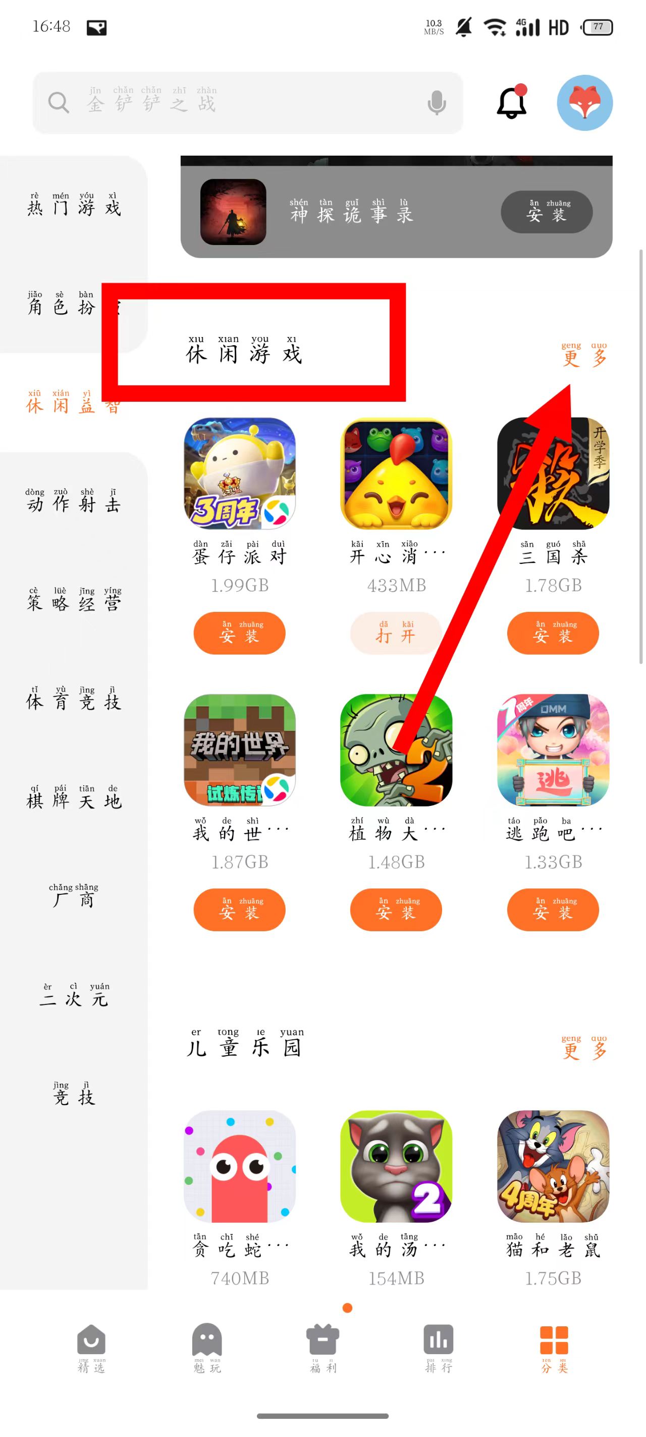 2、在游戏分类页面,找到休闲游戏板块,点击其右侧的更多按钮。