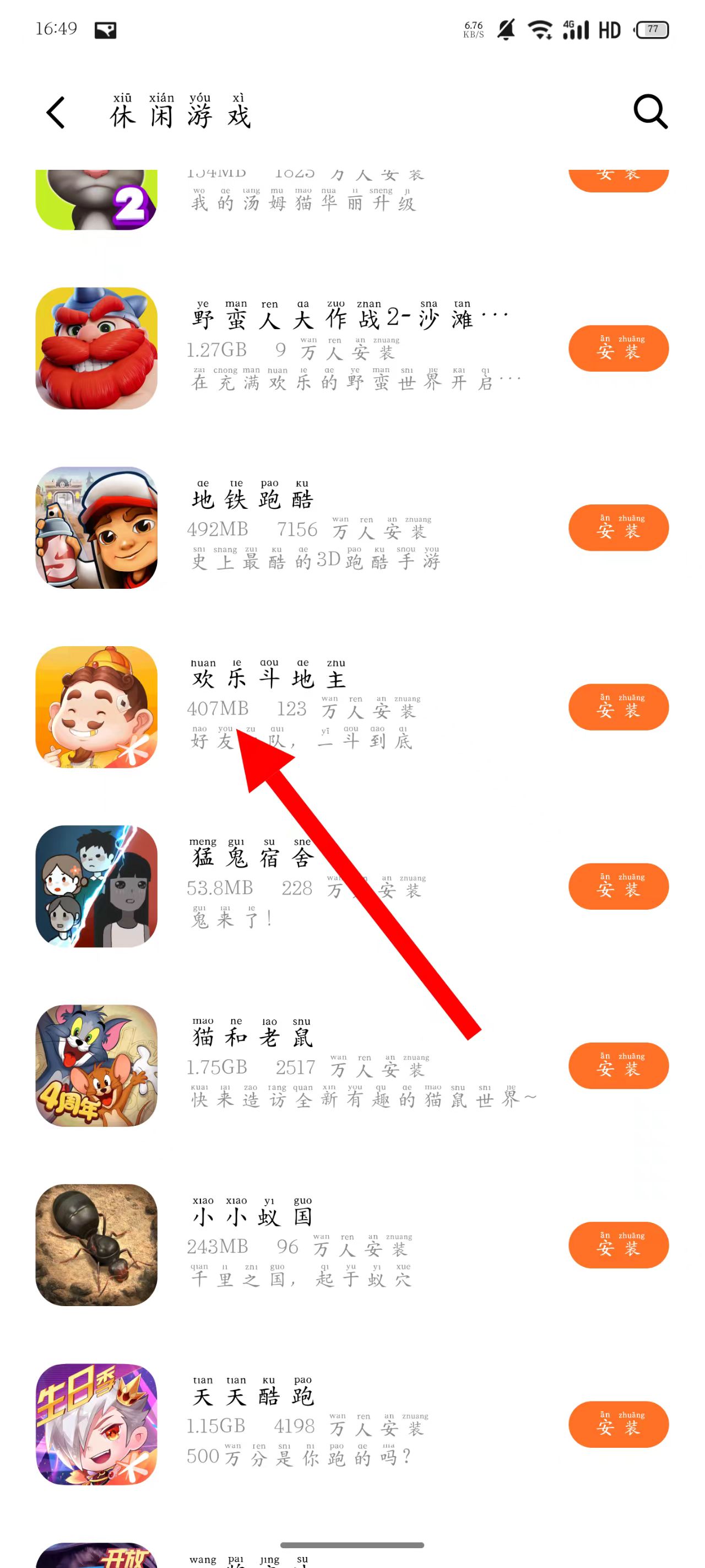3、在休闲游戏列表页面,选择想要安装的游戏,点击进入该游戏的详情页面。