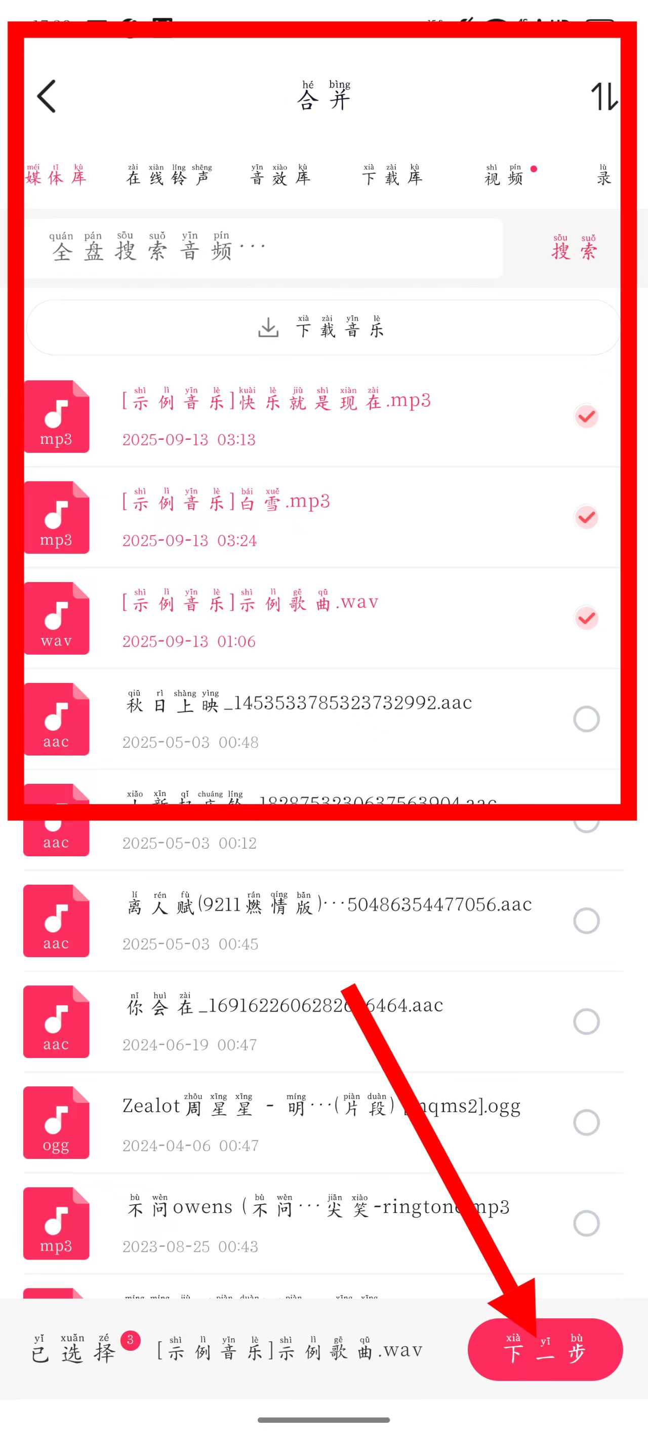 3、挑选需要合并的音频文件,选好后点击下一步,进入音频合并编辑页面。