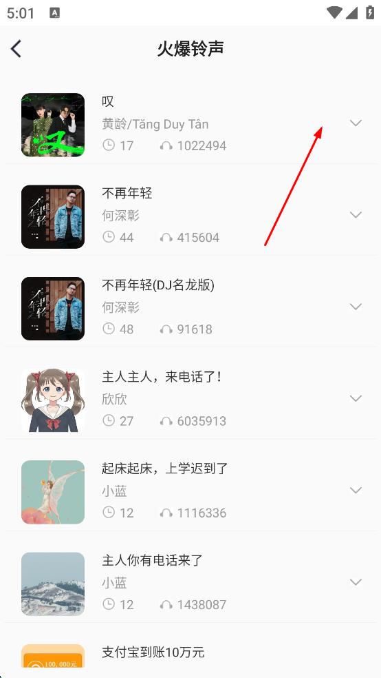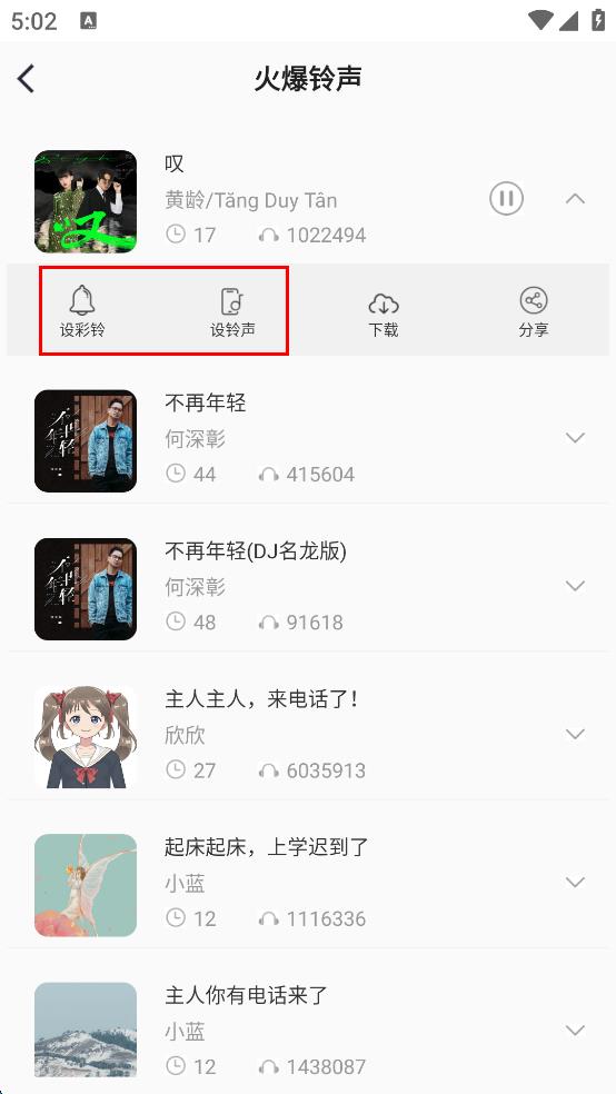 2、在火爆铃声列表页面,浏览展示的各类铃声,选择其中想要设置的铃声,点击该铃声对应的区域,展开操作选项。