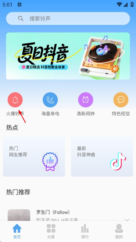 1、打开手机铃声精选APP,进入APP主界面,找到“火爆铃声”选项并点击,进入火爆铃声列表页面。