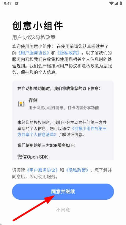 1、打开APP,在弹出的提示框中,点击同意并继续按钮。