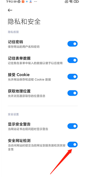4.下滑找到安全网址检测这个功能,点击后面的开关,将之关闭就可以了