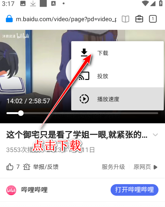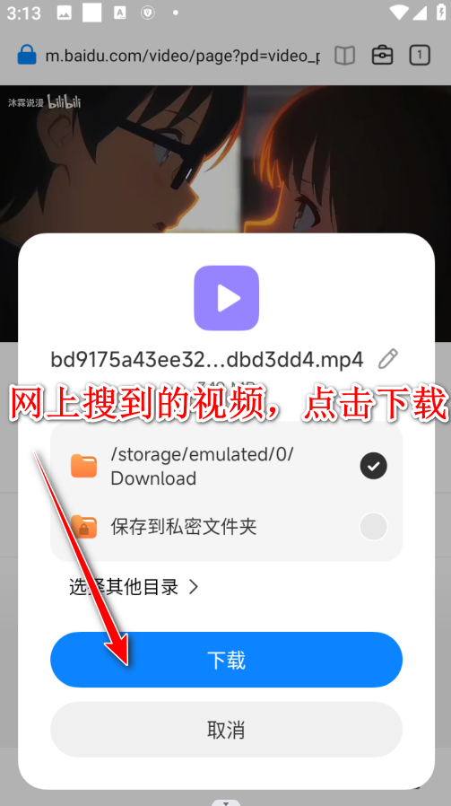 3.跳出下载界面,继续点击下载,这个时候我们已经可以看到视频的下载路径了,storage/emulated/0/Download,默认的路径就为小米浏览器的路径了,你还可以自定义路径。