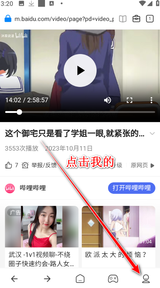 1.进入我们的浏览器,点击屏幕右下方的我的页面