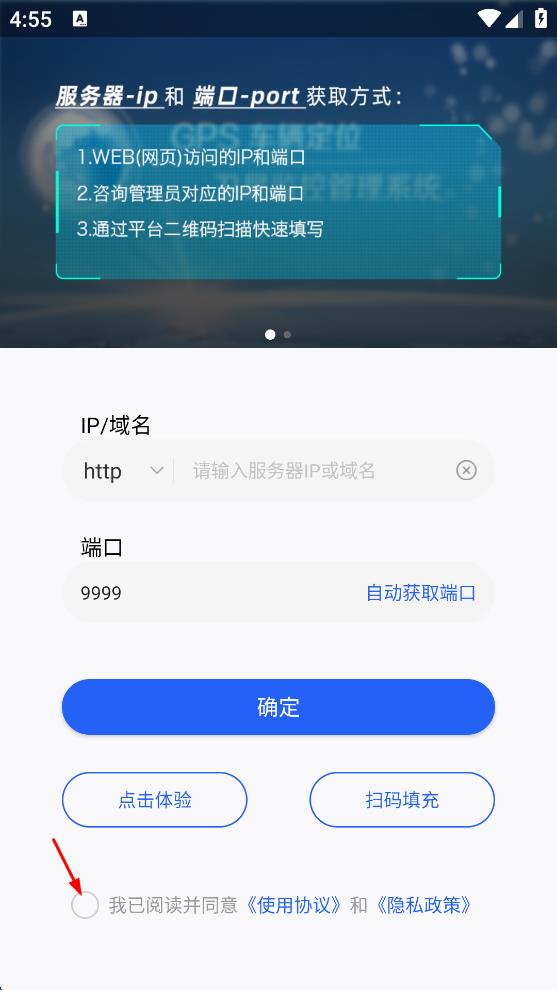1、打开云查车软件,在初始页面勾选“我已阅读并同意使用协议和隐私政策,然后根据提示获取服务器IP/域名和端口,点击“确定”,进入云查车主页面。
