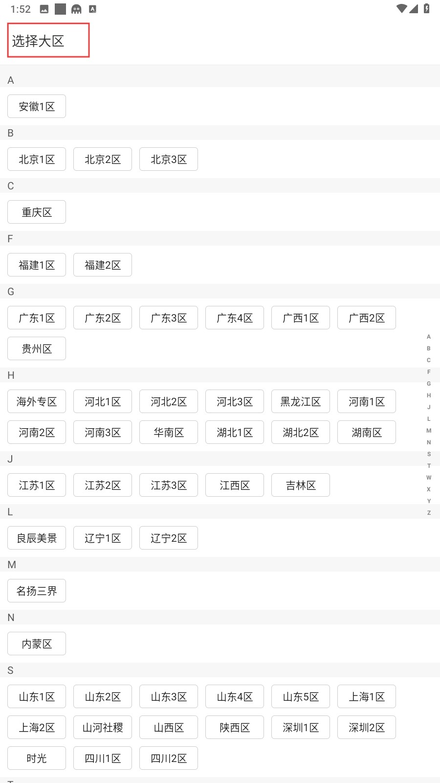 1、选游戏大区时,在【选择大区】页按地域选对应区服。