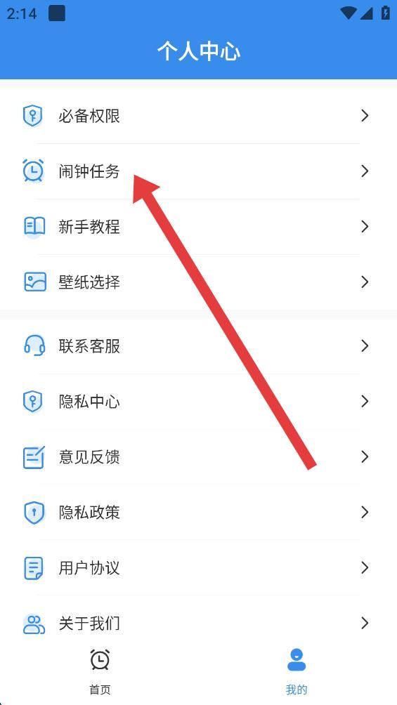 2、在个人中心页面里,找到并点击闹钟任务选项,进入闹钟任务的设置界面。