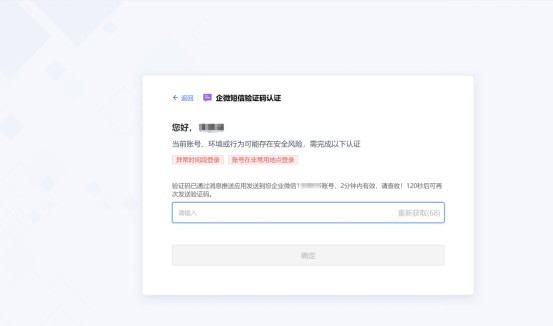 2、如登录操作触发风险检测规则,零信任平台会通过企业微信工作台中“网络安全中心”应用推送验证码进行二次认证