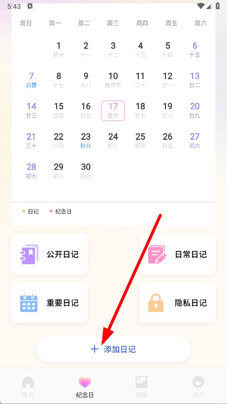 2、在纪念日页面,点击添加日记按钮,进入添加日记页面。