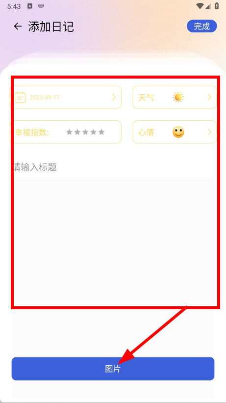 3、设置日期、天气、幸福指数,输入标题,点击图片按钮添加图片。