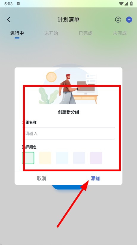 4、输入分组名称,选择颜色,点击添加按钮,完成豆画清单的创建。