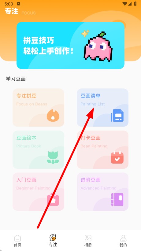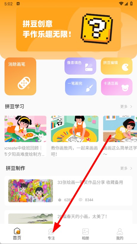 1、打开豆画拼豆APP,点击底部专注选项,进入专注页面。