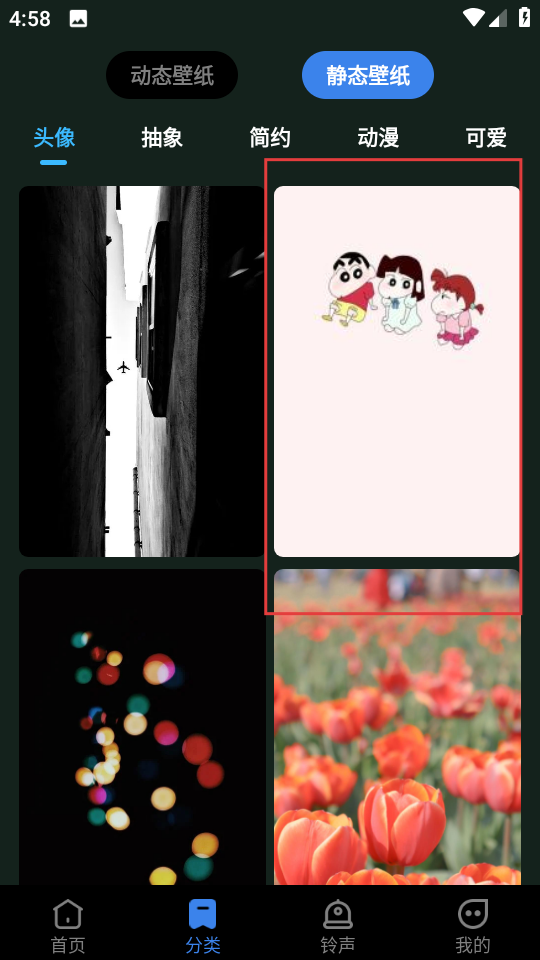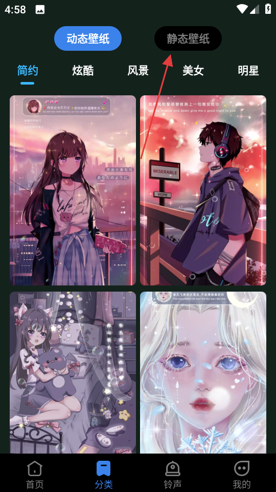 2、在分类页面,点击静态壁纸选项,进入静态壁纸页面。