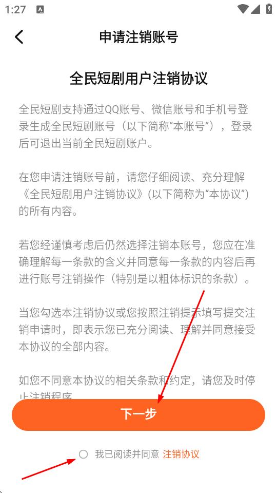 5、进入申请注销账号页面,仔细阅读《全民短剧用户注销协议》,勾选“我已阅读并同意注销协议,点击下一步。