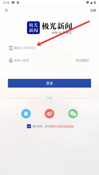 4、在勾选完同意按钮后,点击上方输入框依次输入手机号码和密码后,完成登录操作。