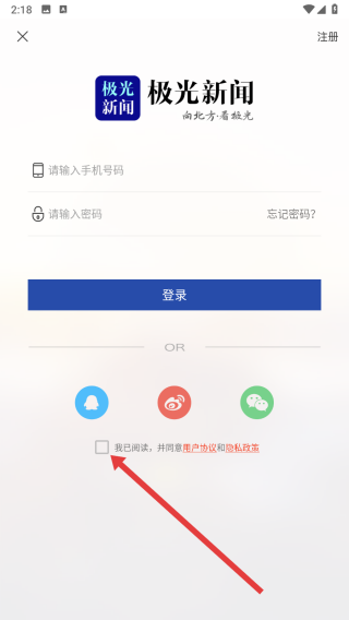 3、在跳转到登录页面时,需要先点击方框勾选同意协议与政策条款。