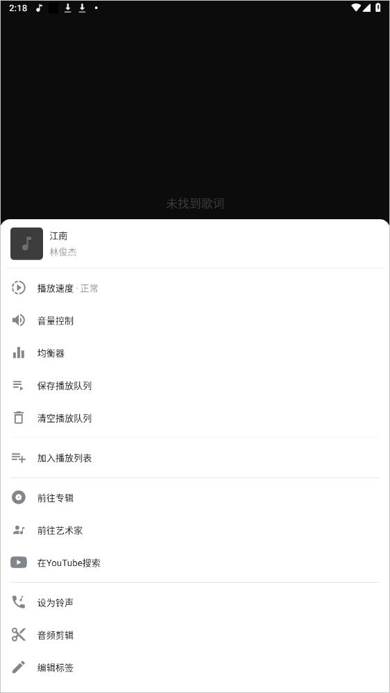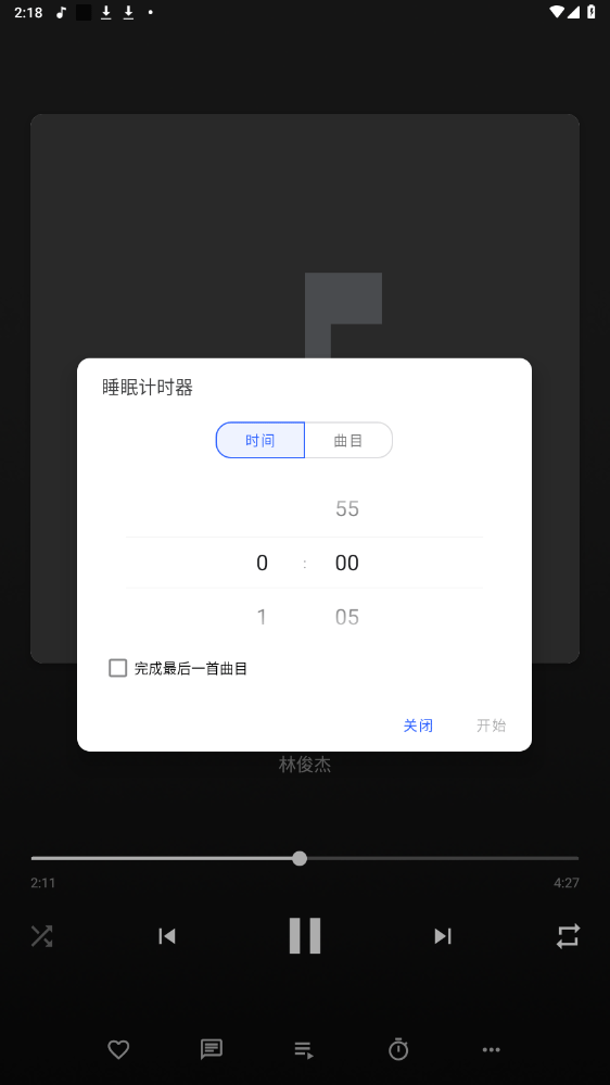 4、进入播放详情界面,可以设置定时播放,搜索歌词等功能