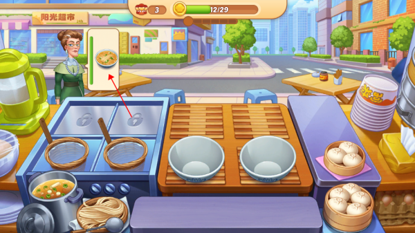 3、注意火候,当食材制作完成时,点击食材捞出,再点击食品即可给有需求的顾客