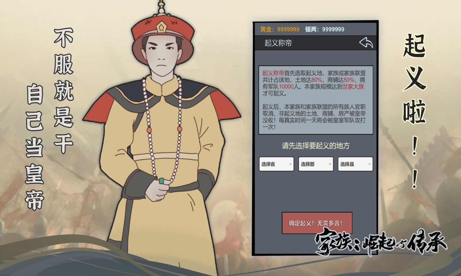 家族崛起与传承是一款模拟穿越古代生活的休闲游戏,回到古代,在这里你将重新开始自己的人生,白手起家,一步步把家族发育起来,最终是选择当地主享受生活,还是争夺皇帝宝座,一统天下,就全看个人想法和本事了。